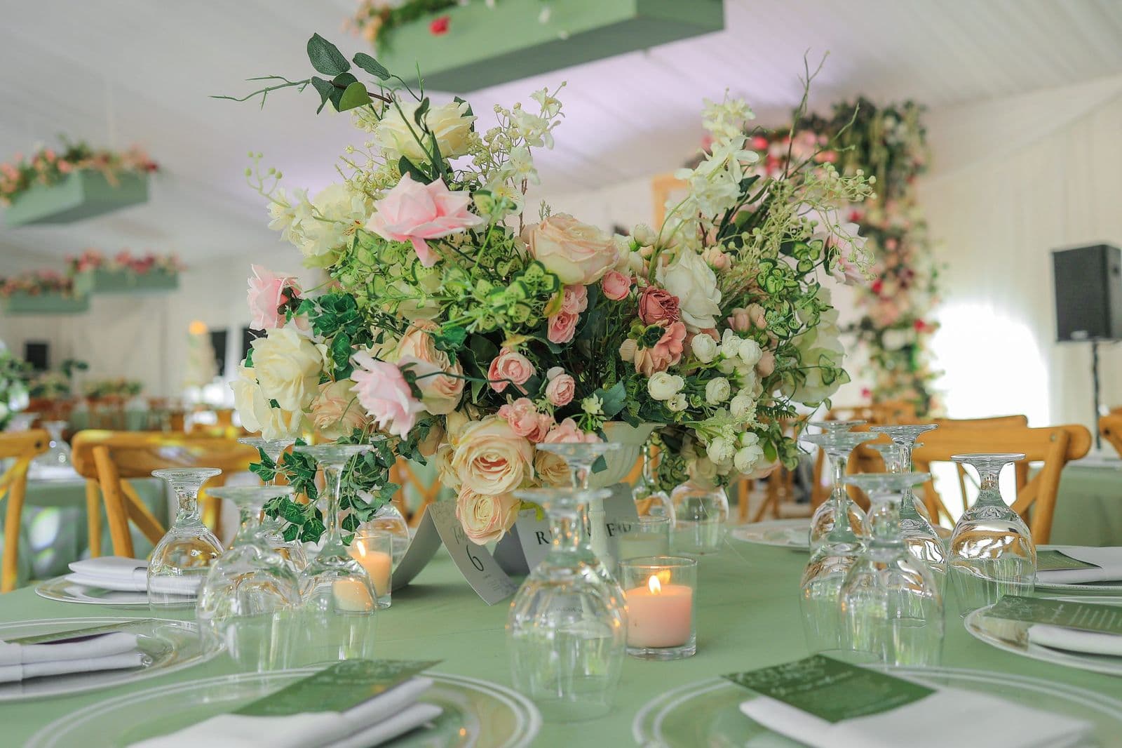 A close-up look at meticulous styling details — tabletop florals, linens, place settings, and decorative accents that complete the look.